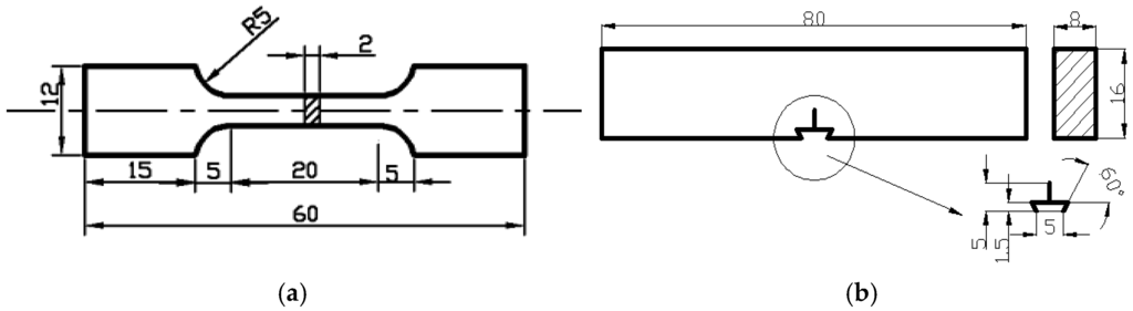 Specimens for (a) tensile; (b) fracture toughness and fatigue crack growth tests.
