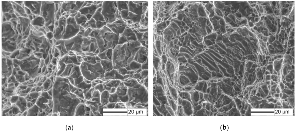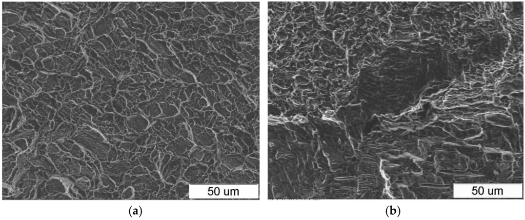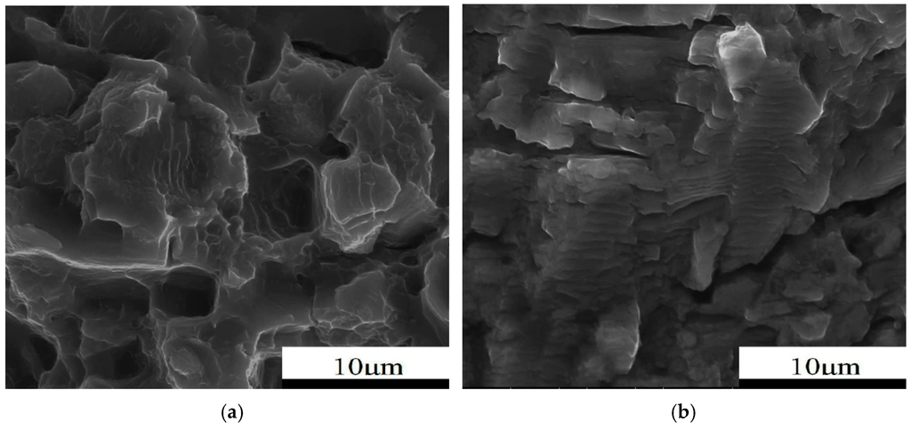Representative SEM micrographs depicting the fracture surfaces of bimodal and lamellar microstructures are shown in Figure 4. It is evident that fracture surfaces of both were covered with dense dimples. Crack propagated in ductile mode, which was also found in Reference []. However, some big differences between the two microstructures were observed. On one hand, the dimples on the fracture surfaces shown in Figure 4a are obviously bigger and deeper than those shown in Figure 4b. This indicates that the bimodal microstructure has higher plasticity than the lamellar microstructure, which is consistent with the tensile results shown in Table 2. On the other hand, the fracture surface of the lamellar microstructure is characterized by secondary cracks and a big fracture step, which increases the toughness.