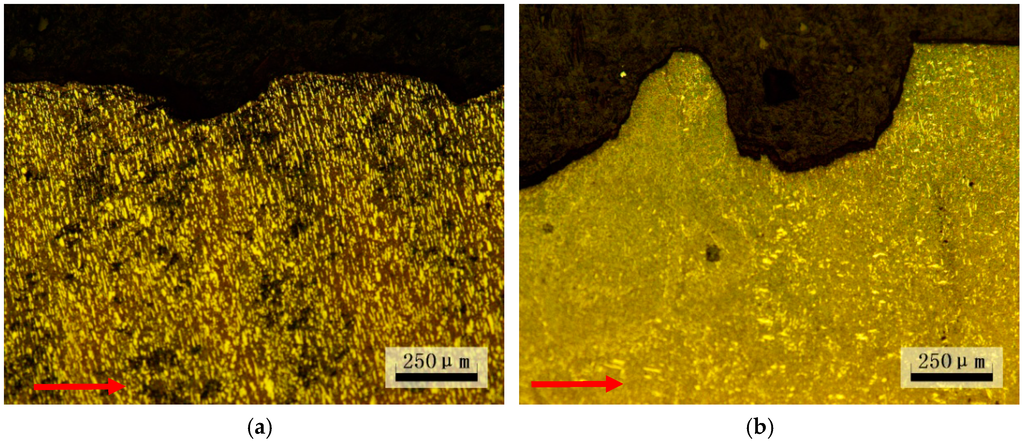 Previous investigations found that there was a positive correlation between the crack path length and the fracture toughness [,,]. Therefore, the crack path geometry has to be taken into account as a parameter responsible for the different fracture toughness. As depicted in Figure 5 (the nominal crack propagation direction is indicated by the arrow), bimodal and lamellar microstructures both fractured in tortuous paths during the fracture process, but the lamellar microstructure displays a more tortuous and deflected crack path than the former. Such increased crack-path tortuosity is a major contributor to the higher toughness of the lamellar microstructure. The tortuous and deflected crack path consumed much more energy than the flat one, leading to the higher fracture toughness. Cracks grew along a more tortuous and deflected crack path in lamellar microstructures, which over-compensated the lower ductility, resulting in the higher fracture toughness. The tortuous and deflected crack path was related with the more discontinuous α precipitates at the grain boundary. Therefore, it can be concluded that the long and thick α platelets in the lamellar microstructure can realize a good combination of fracture toughness and strength.