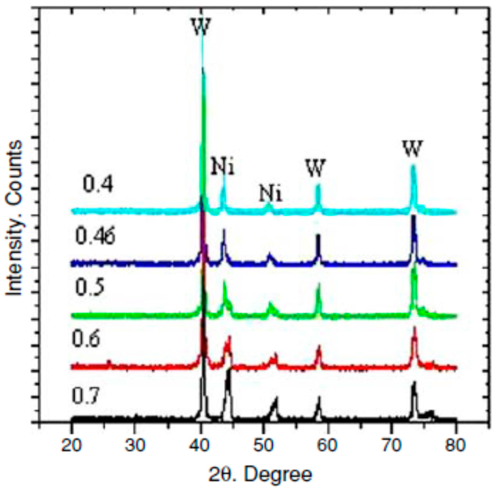 - El-Geassy, A.; Nassir, N.A.; Ahmed, H.; Seetharaman, S. Simultaneous reduction nitridation for the synthesis of tungsten nitrides from Ni-W-O precursors. Powder Metall. 2013, 56, 411–419. [Google Scholar] [CrossRef]