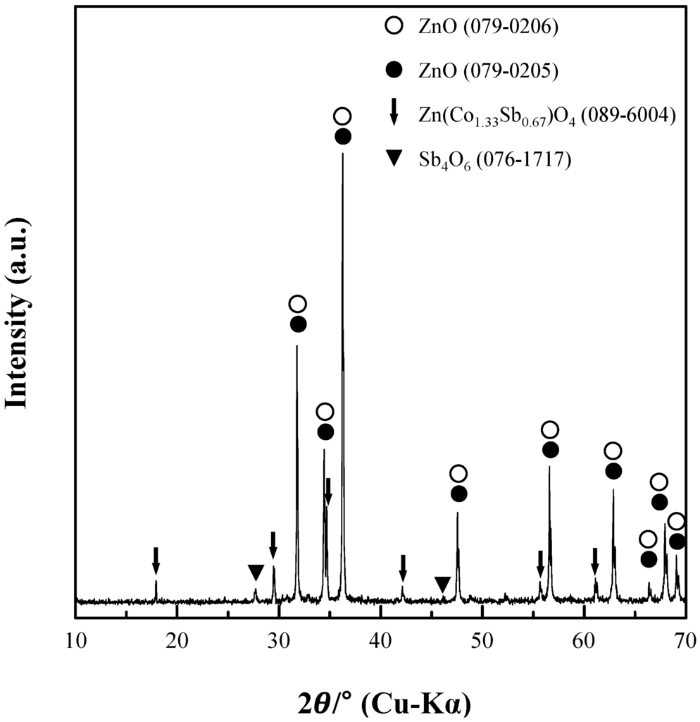 The MOVs with dimensions of 15 mm × 25 mm × 4.5 mm (produced by Thinking Electronic Industrial Co., Ltd., Kaohsiung, Taiwan) were used in the present study. MOVs were ground to a particle size less than 210 μm by using a rod mill, and screened into different sized fractions with Tyler sieves. The −210 μm fraction, containing various metals with chemical compositions, as shown in Table 1, was used as the sample for this study. The chemical composition of MOVs was analyzed using inductively coupled plasma spectrometer (ICP) after these were completely dissolved in aqua regia at 383–393 K. These results are summarized in Table 1. The undersized fraction of MOVs contained 70.97% Zn, 2.76% Sb, and 1.83% Bi as major elements. The analysis of the zinc content of different particle sizes and mass fractions of the MOVs, as presented in Table 2, indicates an increase in the percentage of the zinc content with decreasing particle size. Typical X-ray diffraction (XRD) patterns of the MOVs, prepared by rod milling and sieving, are shown in Figure 1. Major intensity peaks correspond to zinc oxide (ZnO), while minor intensity peaks corresponding to zinc cobalt antimony oxide (Zn(Co1.33Sb0.67)O4) and antimony oxide (Sb4O6) were also detected.