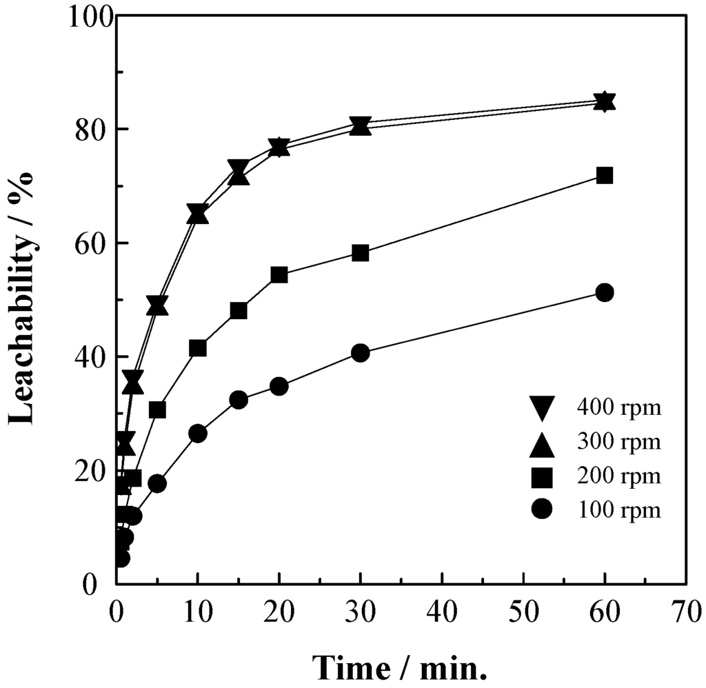 The effect of the agitation speed on zinc leaching was studied using fine particles of 53 to 105 μm and agitation speeds of 100 to 400 rpm. Within the series of experiments, the reaction temperature, initial H2SO4 concentration, and solid-to-liquid ratios were kept constant at 333 K, 0.1 M, and 10 g/L, respectively. Figure 2 shows the effect of the agitation speed on the leachability of zinc.