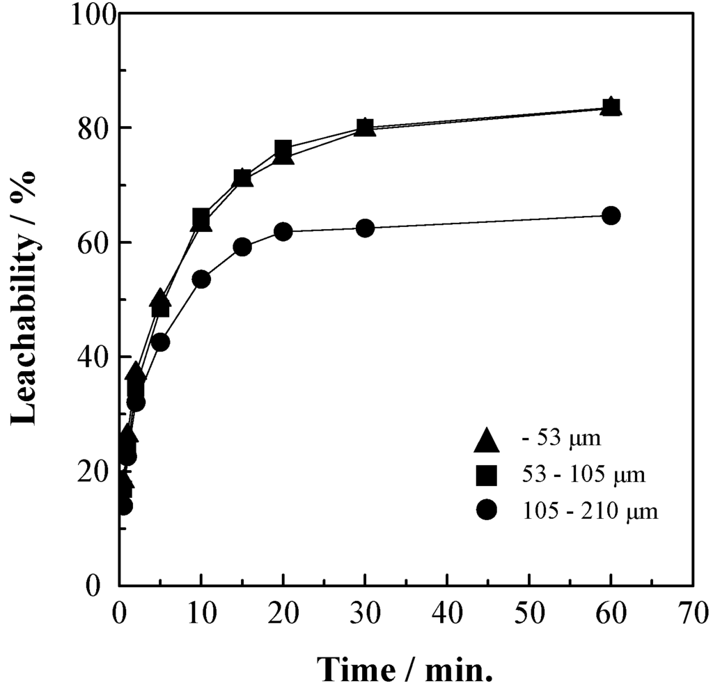 A plot of the leachability of zinc against time using different sized fractions (105–210, 53–105, −53 μm) is presented in Figure 3. In this leaching test, the leaching temperature and initial H2SO4 concentration were fixed at 333 K and 0.1 M, respectively. The results indicate that the leachability of zinc is almost independent of particle size below 105 μm. Thus, for further experiments, particles in the size range of 53 to 105 μm were chosen to minimize the effect of particle size on leaching [20].