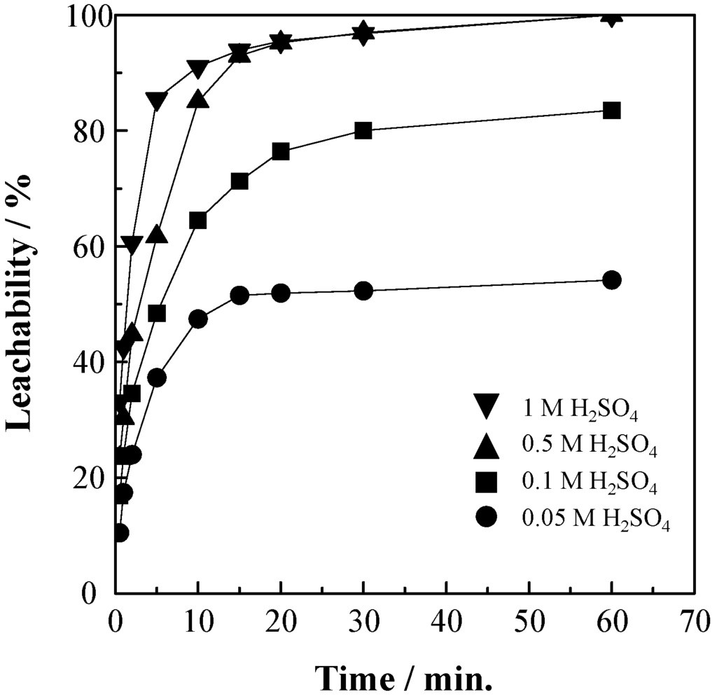 After 60 min, the leaching ratio reached 100% in the H2SO4 concentration range of 0.5 to 1 M, whereas the leaching rate was 83.5% at a H2SO4 concentration of 0.1 M. The effect of H2SO4 concentration found in these investigations agrees well with the results of other investigators [15,16,18]. If all of the zinc in the MOVs is leached, the total zinc concentration will be 0.11 M in the leaching solution because the mole ratio of H2SO4 to zinc ions is 1. The experimental results are almost consistent with the fundamental analysis [21].