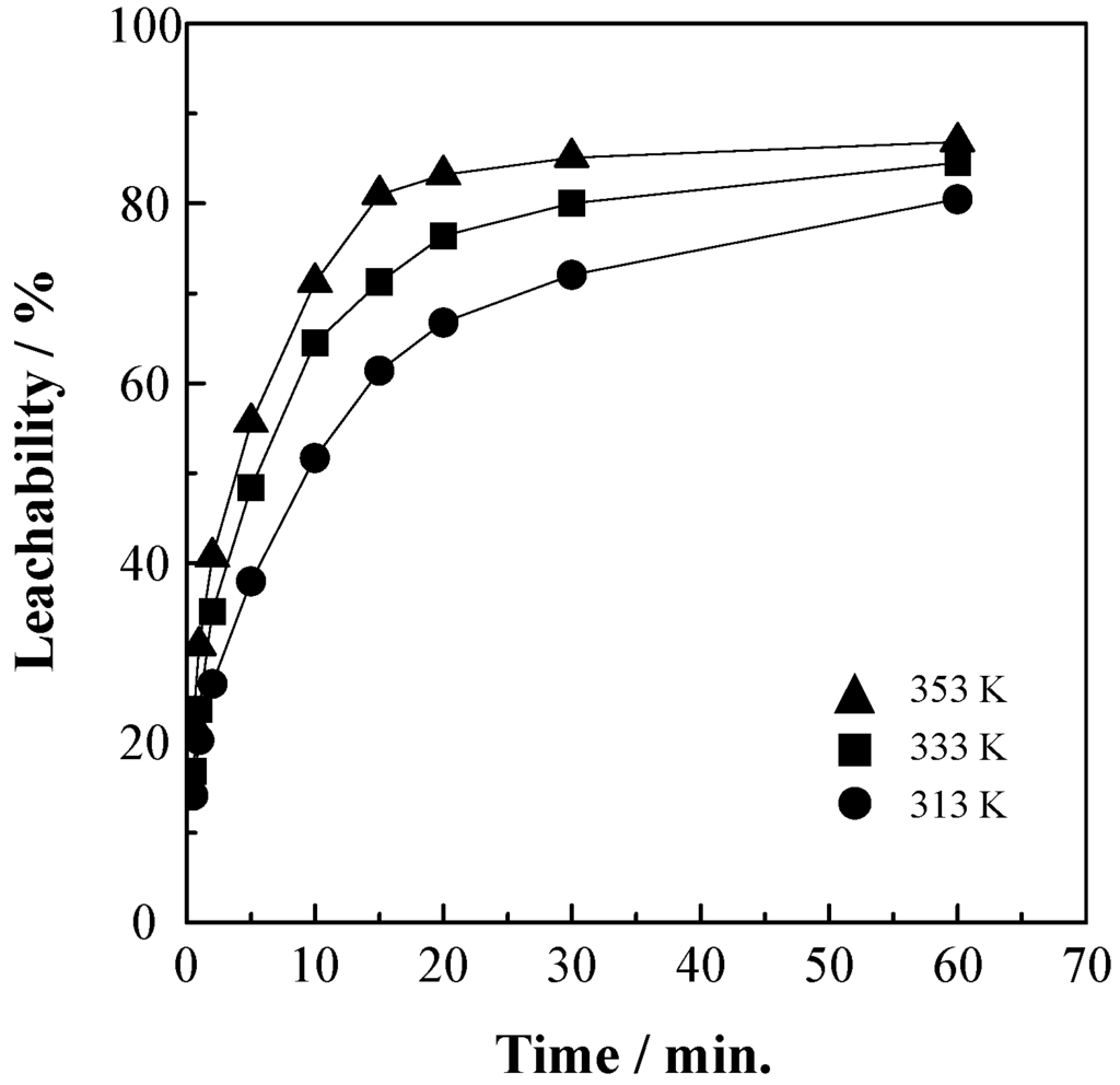 The Figure 5 shows the extent of zinc leaching at different reaction temperatures between 313 K and 353 K while all of the other parameters were kept constant. The results show that the reaction temperatures do not have a noticeable effect on the zinc extraction. The leachability of zinc initially rose very sharply over approximately 15 min. After 15 min of treatment, the leachability of zinc increased slowly with an increase in reaction time. The molecular collisions, mass transfer co-efficient, and reaction constant are improved with increasing temperature [19]. However, when the reaction temperature increased from 313 K to 353 K, the leachability of zinc increased from 80.48% to 86.8% after 60 min in 0.1 M H2SO4. This weak temperature dependence indicates that the dissolution process does not seem to be controlled by a chemical reaction [22].