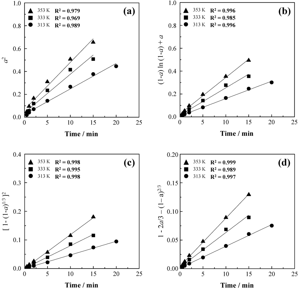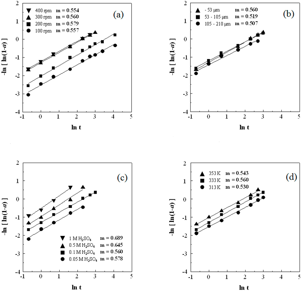 Figure 6c shows that the m-values increased with an increasing initial H2SO4 concentration from 0.578 to 0.689. These results suggest that the diffusion mechanism changes with the initial H2SO4 concentration [25]. However, the m-values were almost constant under variable agitation speed (m-values: 0.554–0.579), particle size (m-values: 0.507–0.560) and reaction temperature (m-values: 0.530–0.560) conditions. Further, all of the m-values in these experiments were below 0.70, indicating that the mechanisms for all of these reactions may be diffusion-controlled.