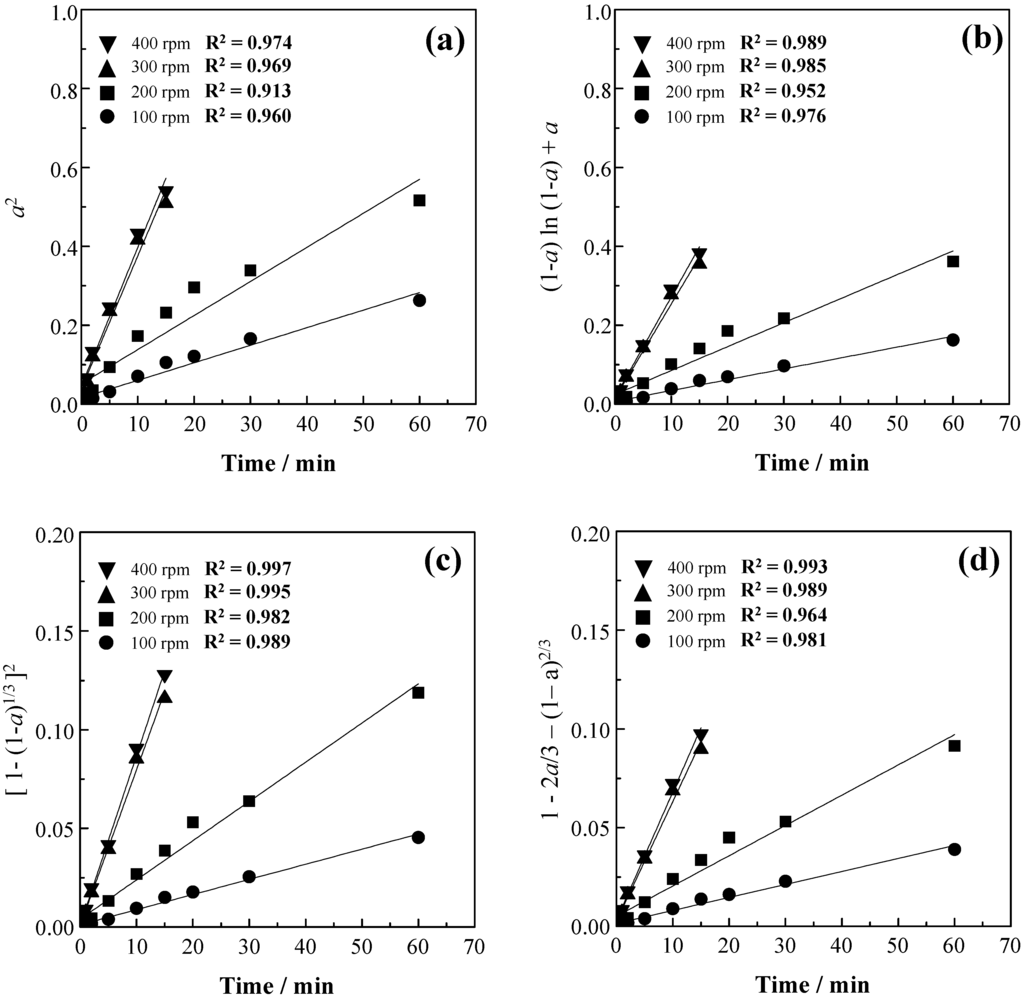 To investigate the relation between m-values and correlation coefficients (R2), zinc extraction at varying agitation speeds, initial H2SO4 concentrations, particle sizes, and temperatures were analyzed according to kinetic equations D1, D2, D3, and D4, respectively, which are shown in Table 3. These expressions were plotted with respect to the reaction time, and the dependence of these diffusion models on the kinetic data was evaluated from R2. The plots of each kinetic equation, that is, D1, D2, D3, and D4, versus reaction time under various conditions are shown in Figure 7, Figure 8, Figure 9 and Figure 10, respectively.