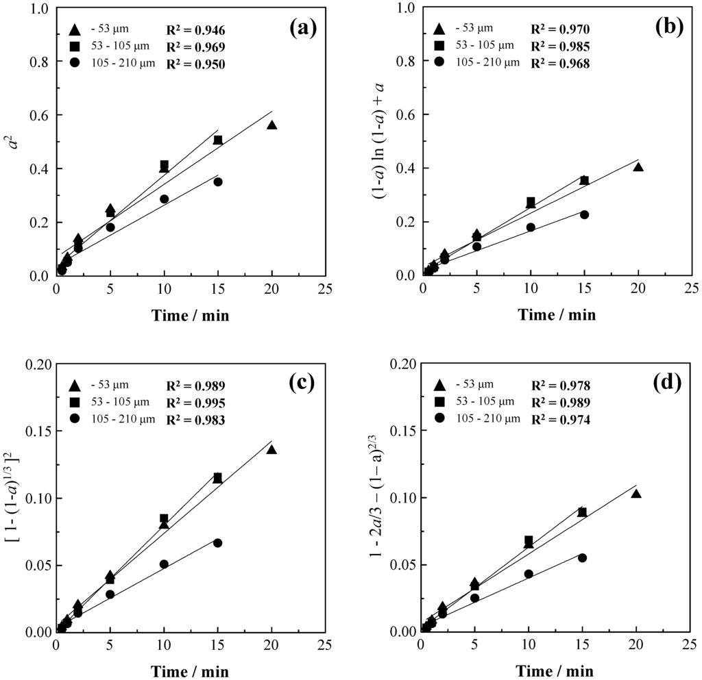 Generally, the R2 values for Equations D2 and D4 versus reaction time are similar (Figure 7b,d, Figure 8b,d, Figure 9b,d and Figure 10b,d), because Equations D2 and D4 have the same m-values. In addition, D3 provided a better fit for the kinetic data compared to Equations D1, D2, and D4. On the other hand, Figure 7, Figure 8, Figure 9 and Figure 10 had smaller R2 values for equation D1 versus reaction time those of D2, D3, and D4 versus reaction time for the case of zinc leaching. This may be because the m-values that were calculated using D2, D3, and D4 are in the range of 0.507 to 0.579, which is close to the m-values determined by D2, D3, and D4, as shown in Table 3.
