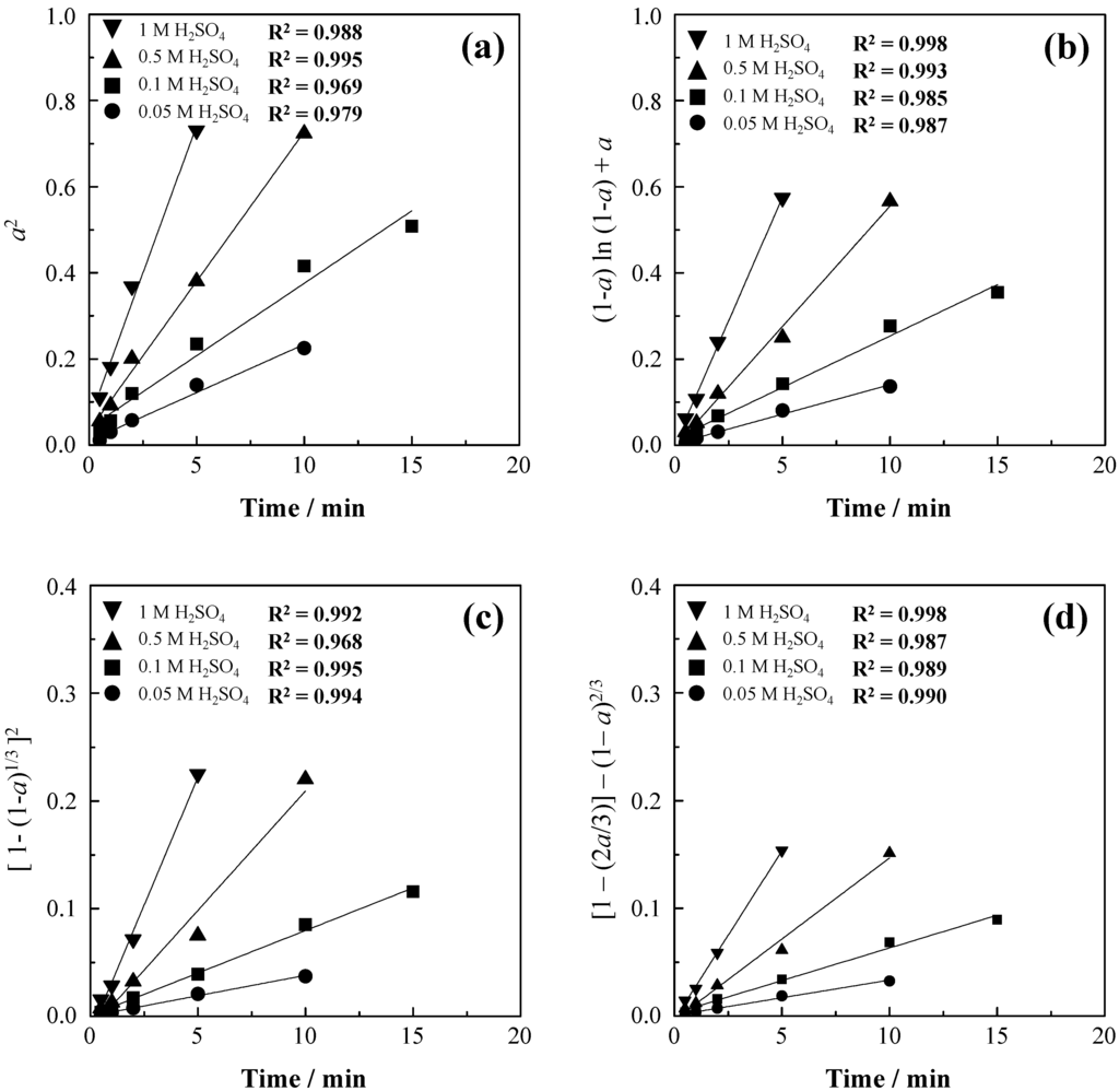 The plots of D1, D2, D3, and D4 versus reaction time at different H2SO4 concentrations show that D1 versus reaction time has a good linear relation at H2SO4 concentrations of 0.5 M and 1 M (m-values: 0.645 and 0.689, respectively) (Figure 9a). However, the leaching data for 0.05 M and 0.1 M H2SO4 (m-value: 0.578 and 0.560, respectively) did not fit well to D1 versus reaction time, as shown in Figure 9a.