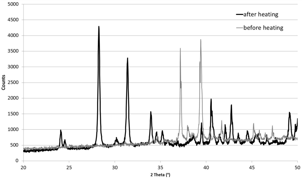 First, the product was observed utilizing X-ray Powder Diffraction (XRD) for microstructural characterization, and SEM for a morphological and compositional characterization. Figure 1 shows the XRD patterns of the initial Cu10Zr7 phase at room temperature, and of the product obtained after heating up to 1373 K: it is evident that the heating produces a compound having characteristic peaks, which are the subject of investigation in this work.
