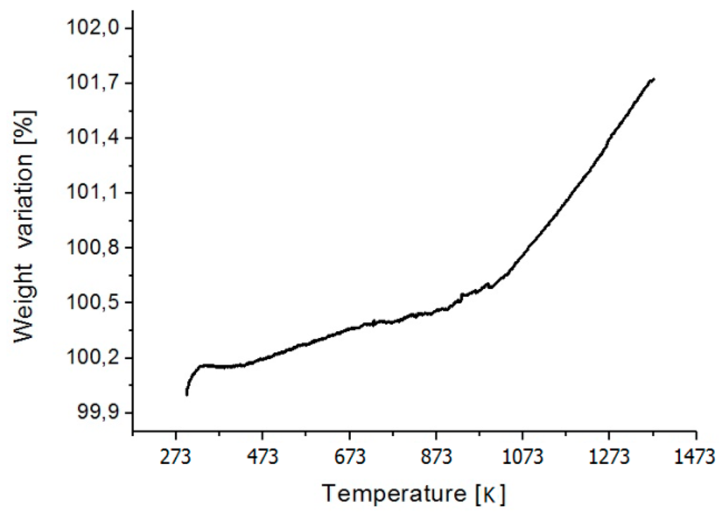 On the other hand, the Back-Scattered Electrons (BSE) mode enabled us to determine a sort of confirmation of the Cu/Zr ratio: the chemical composition of the oxide was predominantly Zr-based (as expected), because of the higher reactivity of Zr with O than Cu. The chemical composition, calculated on the basis of EDS analysis, is the following: Cu11.6Zr27.5O60.9 (at %). For the high reactivity of Zr with O, TG/DTA analysis was performed on small sample of Cu10Zr7 intermetallic (about 10 mg in weight) till 1373 K (the same temperature reached during the X-ray analysis). Figure 3 shows the weight gained, which can be divided into two parts, as a function of the temperature: the first one with a gain rate of about 8.2 × 10−4 %/K in the temperature range [473; 1023 K] and the second one of about 4.6 × 10−3 %/K in the temperature range [1023; 1373 K].