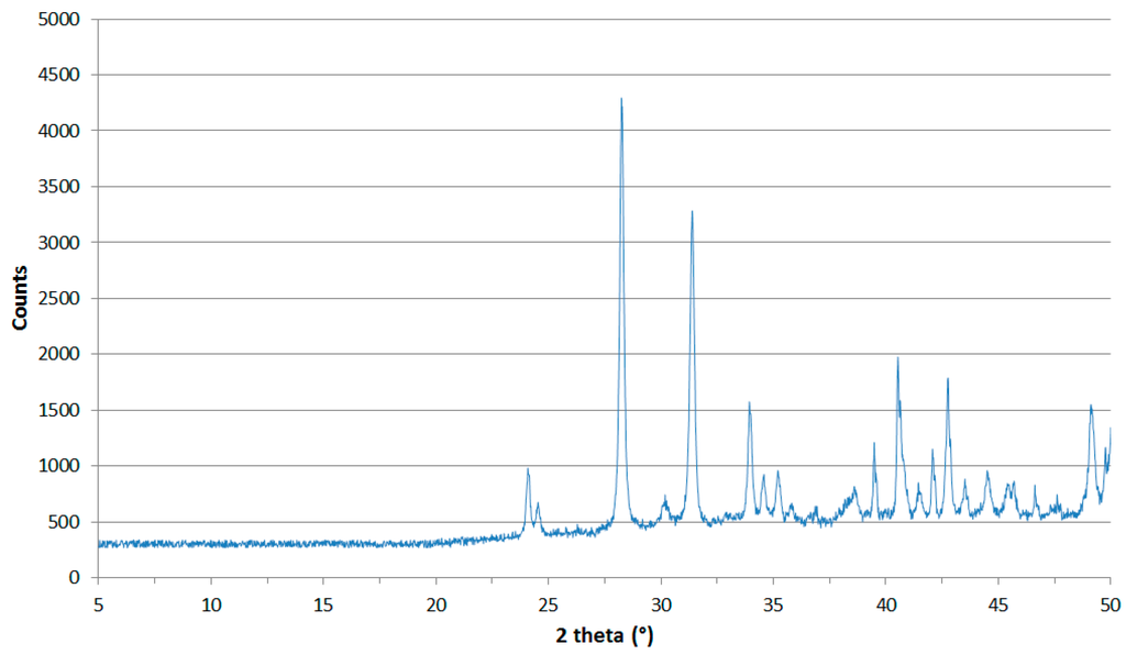 During a thermodiffractometric study of a copper–zirconium alloy [12,13,14,15], we observed the formation of an oxide on the surface of the Cu10Zr7 sample. The experimental conditions in which the oxide was synthesized were the following: starting from room temperature (RT), the temperature was increased in 50 K steps until 1373 K (in air). After each step, an X-ray measurement—taken 10 min from the stabilization of the temperature—was performed. A change in the composition of the sample was observed starting at 923 K. Analyzing the last diffractogram (recorded at 1373 K) we noticed that a mixed metal oxide containing copper and zirconium, isomorphous to the crystal structure of monoclinic zirconia, was probably present. Copper(I) oxide was not present, except in a small amount, which we took into account during the structural analysis; however, we could not separate it in the Energy Dispersive Spectroscopy EDS analysis.