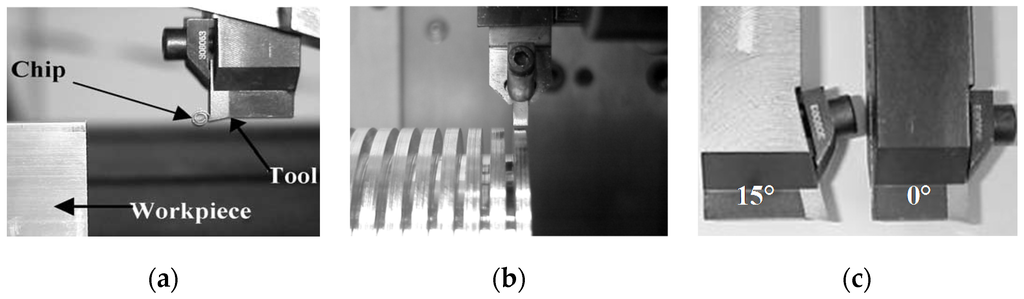 Experimental setup of orthogonal cutting tests: (a) planar machining; (b) turning; and (c) cutting tools with two rake angles (0° and 15°) [11].