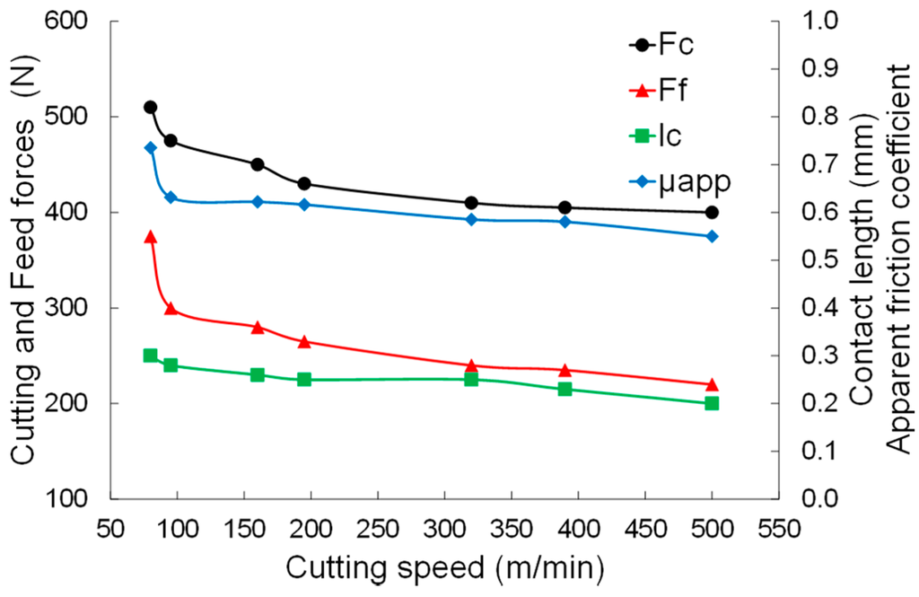 Additional experimental tests have been done under orthogonal turning to bring out the effect of cutting speed, with cutting tool angle of 0° and feed rate fixed to 0.1 mm/rev. The depth of cut is the same as in planing process (i.e., 4 mm). Results are reported in Table 2 and Figure 5. The apparent friction coefficient, reported in Figure 5, is determined as the ratio of feed force by cutting force in the case of considered rake angle (i.e., 0°).