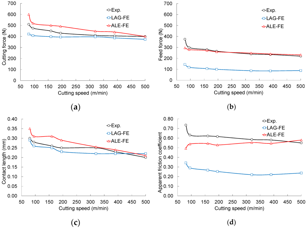 Experimental vs. numerical modelling (ALE-FE and LAG-FE) of (a) cutting force; (b) feed force; (c) contact length, and (d) apparent friction coefficient.