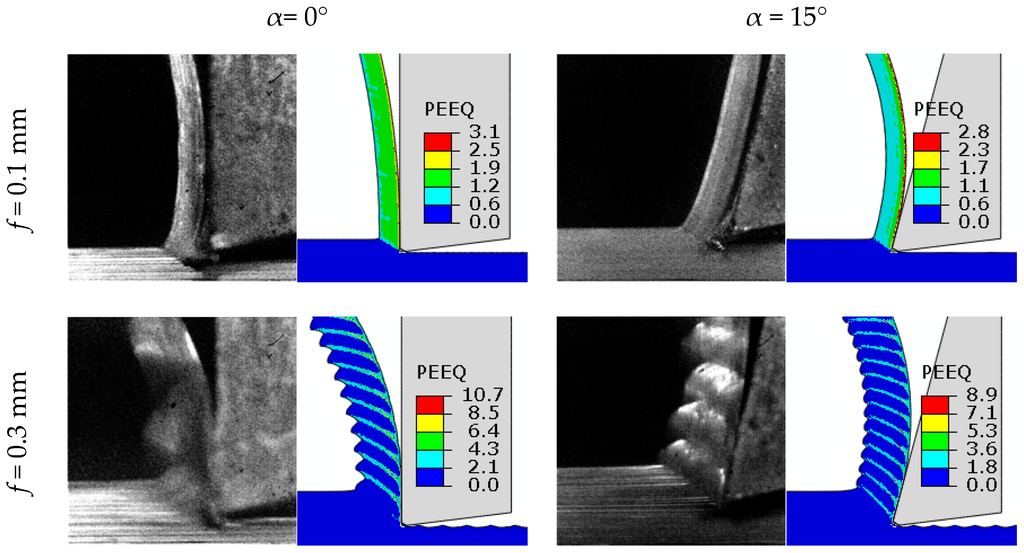 The chip morphology often carries the signature of correct behavior chosen in simulations. From Figure 8, it can be seen that simulated chips are in good agreement with what it is observed by CCD camera. For the small feed (0.1 mm) continuous shape is obtained regardless of rake angle. For the large feed (0.3 mm) segmented chips are well reproduced for both rake angles.