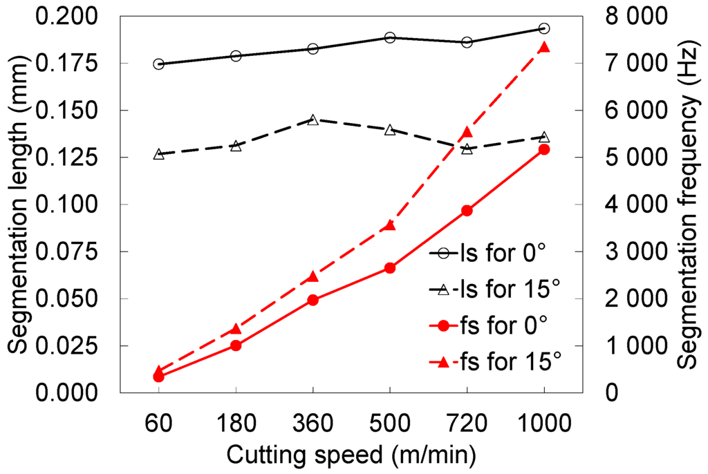 Segmentation length vs. segmentation frequency as function of cutting speed, for fixed feed (0.3 mm) and two rake angles (0° and 15°).