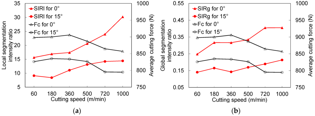 Hence, to quantify the intensity of chip segmentation phenomenon, introduced and parameters were assessed. As shown in Figure 11, these two parameters increase with cutting speed and tend to stagnate at high cutting speed. This confirms that increasing cutting speed promotes the chip segmentation, as was often observed in experimental tests. Hence, these parameters are adequate to quantify the intensity of chip segmentation phenomenon. In addition, Figure 11 brings out the close link between chip segmentation intensity and average cutting force. For each rake angle, as cutting speed increases, average cutting force decreases and and parameters increase. This confirms that the chip segmentation phenomenon is at the origin of the cutting force reduction when machining aluminum alloy AA2024-T351.