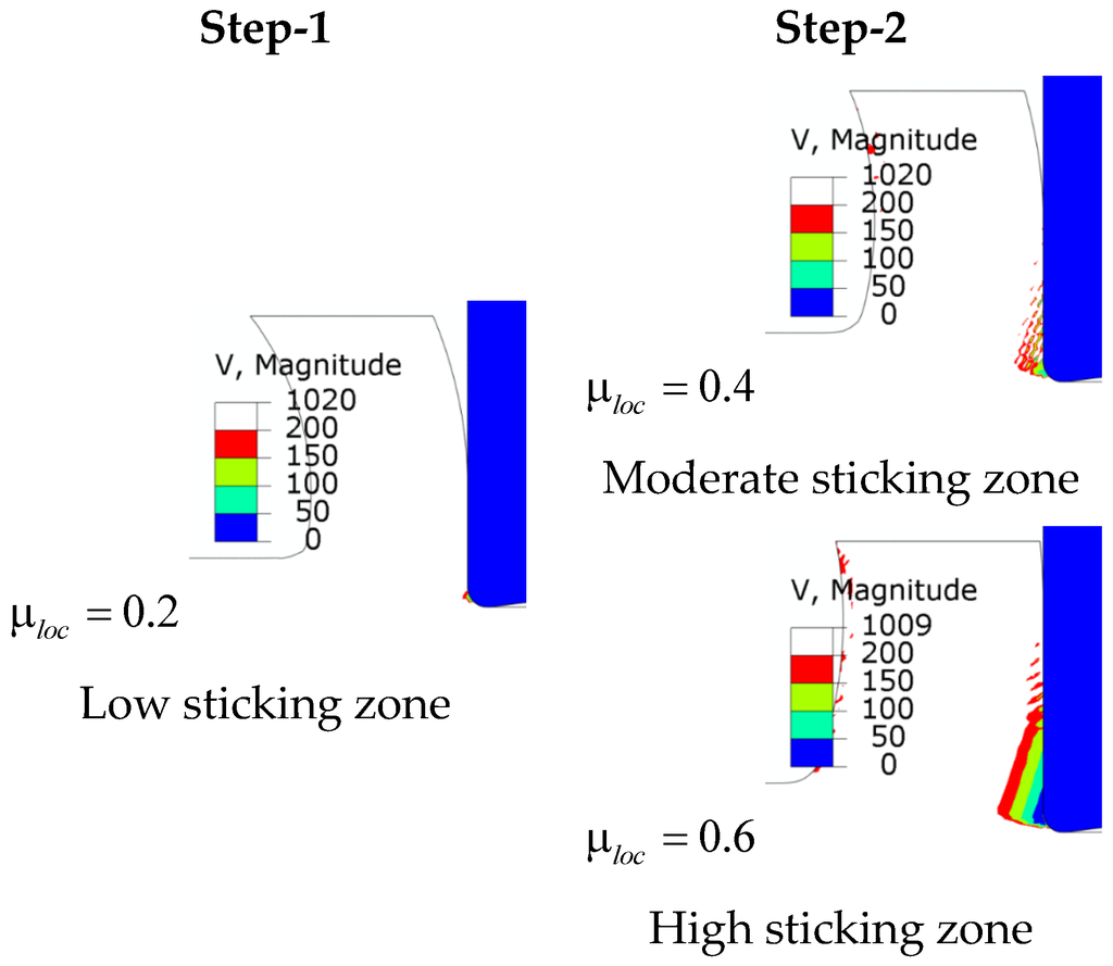 One possible mechanism of BUE formation is an abrupt change of the friction at the tool–chip interface. Two successive steps are then defined. In the first one (step 1), the cutting process was simulated with COF equal 0.2. In the followed step (step 2), the simulation is continued with COF equal 0.4 or 0.6. The impact of this abrupt change of COF on BUE formation is highlighted in Figure 12, through the work material flow velocity at the secondary shear zone. It can be deduced from Figure 12 that the work material flow velocity is affected by the increase of COF. The change in work material flow is more pronounced for a higher COF in the second step (i.e., COF = 0.6). The sticking zone becomes large as the friction is higher. For the low friction, (COF = 0.2 in step 1) a negligible sticking zone can be noticed and, consequently, no BUE can form. Therefore, it can be deduced that a change in the nature of the tool-work material contact have a direct effect on the BUE formation.