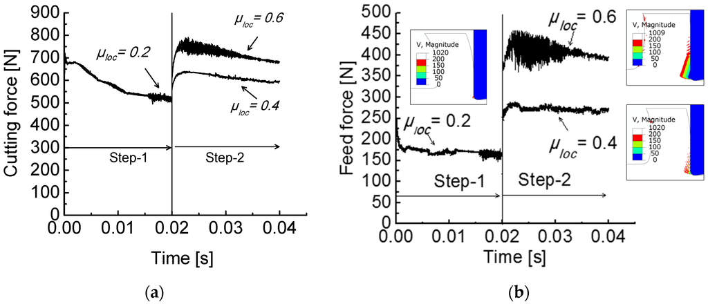 In addition, the abrupt change of the COF also has a significant effect on cutting and feed forces, as shown in Figure 13. So increasing COF increases cutting and feed forces. The chip flows with more difficultly at the rake face, resulting in the increase and fluctuation of cutting forces. Note that feed force is more affected by the friction change (see from Figure 13b), since it is in the direction of the friction stress on the rake face (rake angle = 0°).
