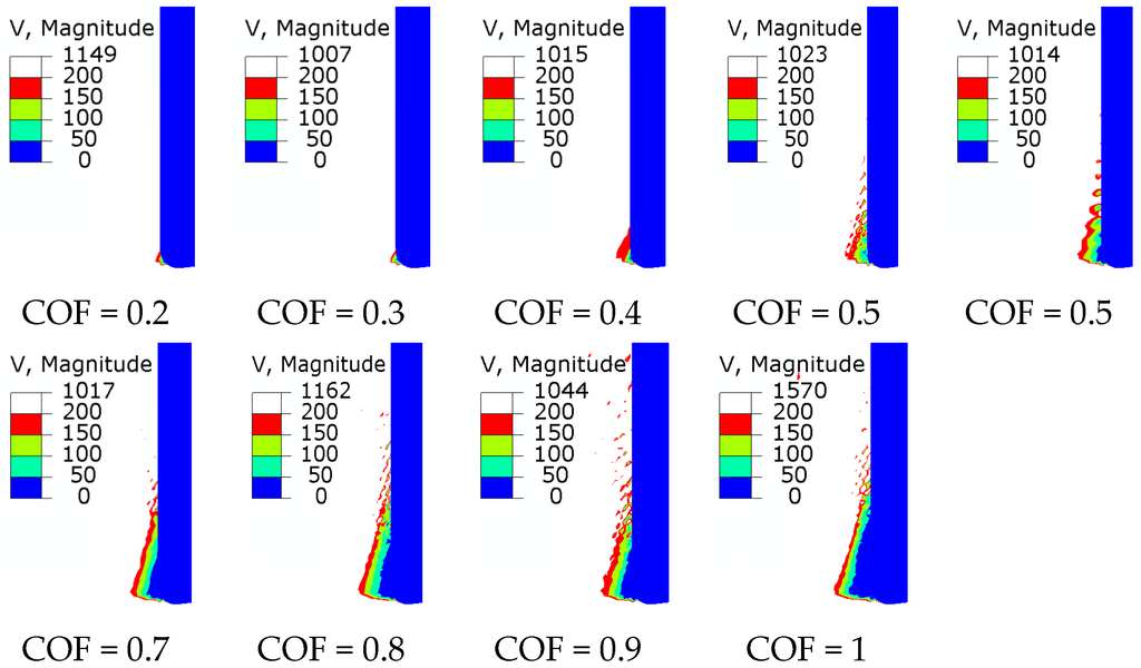 The second possible mechanism of BUE formation corresponds to a gradual evolution of the friction at the tool-work material interface during chip formation. This is represented by the increase of COF gradually (increment of 0.1 is taken) from 0.2 to 1. This assumes that BUE is formed when the friction increases gradually to a higher level that leads to a complete adhesion of the work material at the rake face (sticking contact). According to Figure 14, the process of BUE formation can be viewed from the evolution of work material flow velocity with COF. The gradual increase of the friction increases the amount of the sticking zone. This later represents the work material having low flow velocity at the tool-chip interface. So the variation of the sticking zone with the friction can be correlated with the BUE formation.