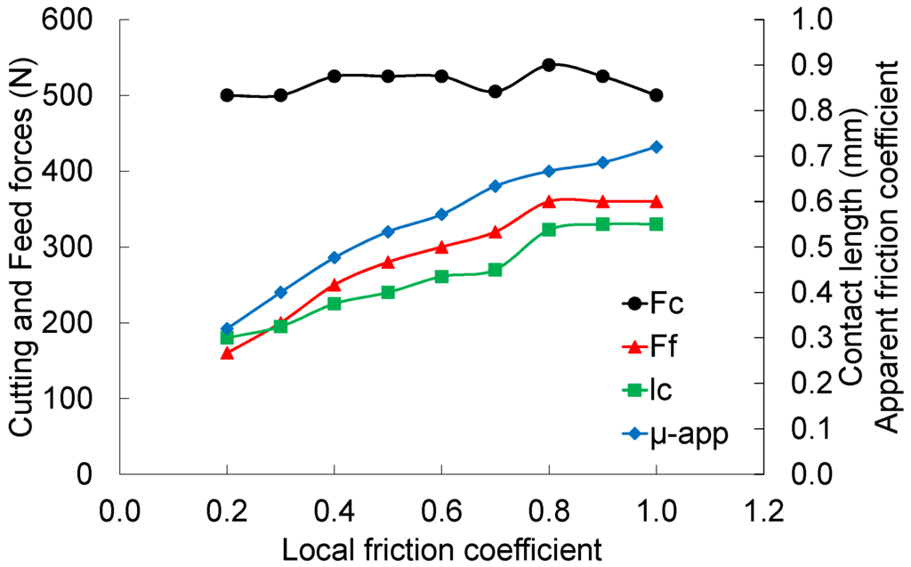 The gradual increase of the friction also affects cutting forces, as shown in Figure 15, with more effect on feed force. The apparent friction coefficient follows the same trend as feed force. Globally, the ratio of the sticking by the sliding contact increases as the friction increases. For high friction, the sliding of the work material layer at the tool-chip interface is practically controlled by the shear flow stress of the work material (i.e., in Equation (6)). According to Figure 15, the average contact length follows the same trend as the apparent friction coefficient. It increases until reaching a quasi-saturated level. So the BUE formation can be related mainly to the dominant sticking contact at the tool-chip interface.