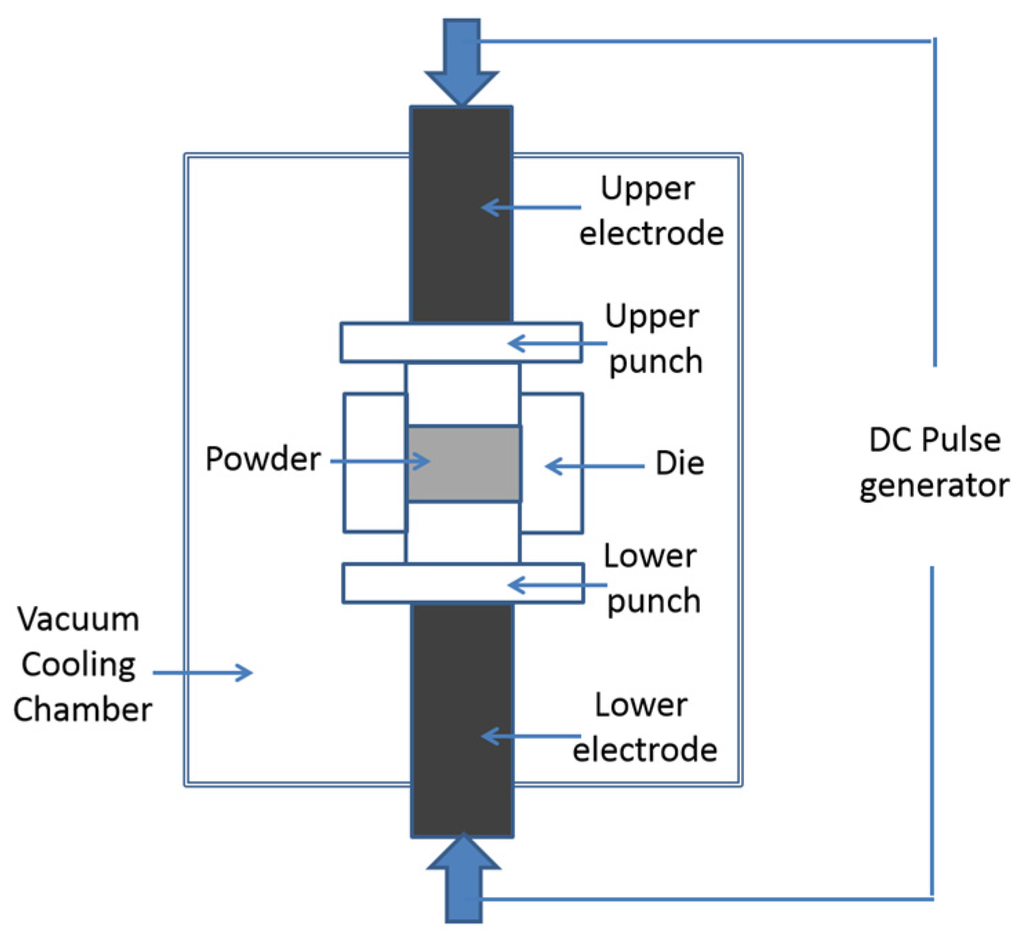 In order to overcome this problem, another method is used for quick sintering of nanocrystalline alloys obtained by MA, spark plasma sintering (SPS). SPS involves the application of high amperage pulsed current (up to 5000 A) through the sample kept usually in a graphite die, while simultaneously applying pressures to the tune of about 100 MPa, as shown in Figure 1. The pulsed current leads to the formation of spark plasma at the particle-particle interface in short periods causing almost instantaneous heating of the powder particles. This leads to sintering being completed within a few minutes in contrast to conventional sintering which takes a few hours.