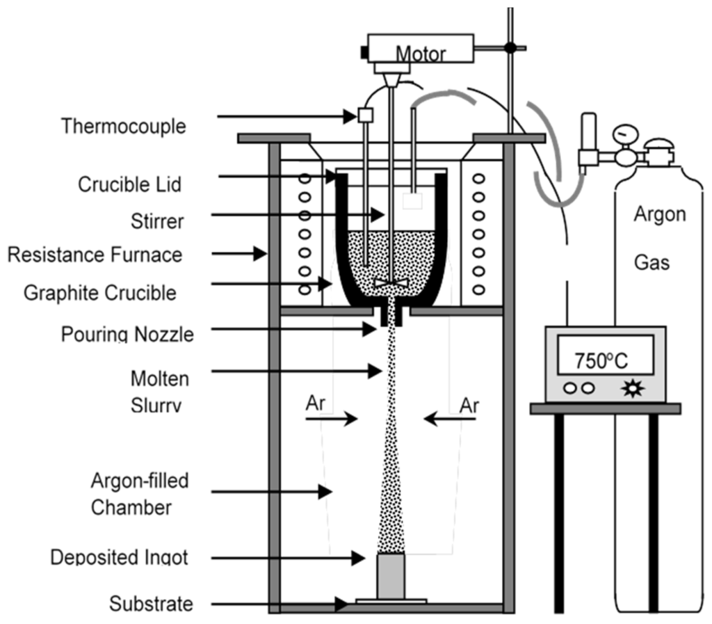 Another unique synthesis technique that can be used for the synthesis of LWHEAs is disintegration melt deposition (DMD) technique. Figure 2 shows a schematic diagram of DMD technique, which was developed in early 1990s [85]. DMD is a processing technique, which brings together the cost-effectiveness associated with conventional casting process and scientific innovativeness and technological potential associated with spray forming process. However, unlike spray forming, DMD technique uses lower impinging gas jet velocity. Within a graphite crucible, the alloy material is superheated above the melting temperature under the Ar gas atmosphere using a resistance heating furnace. For achieving homogeneous composition, the superheated slurry is stirred at 465 rpm for 5–10 min using a twin blade with a pitch of 45°.