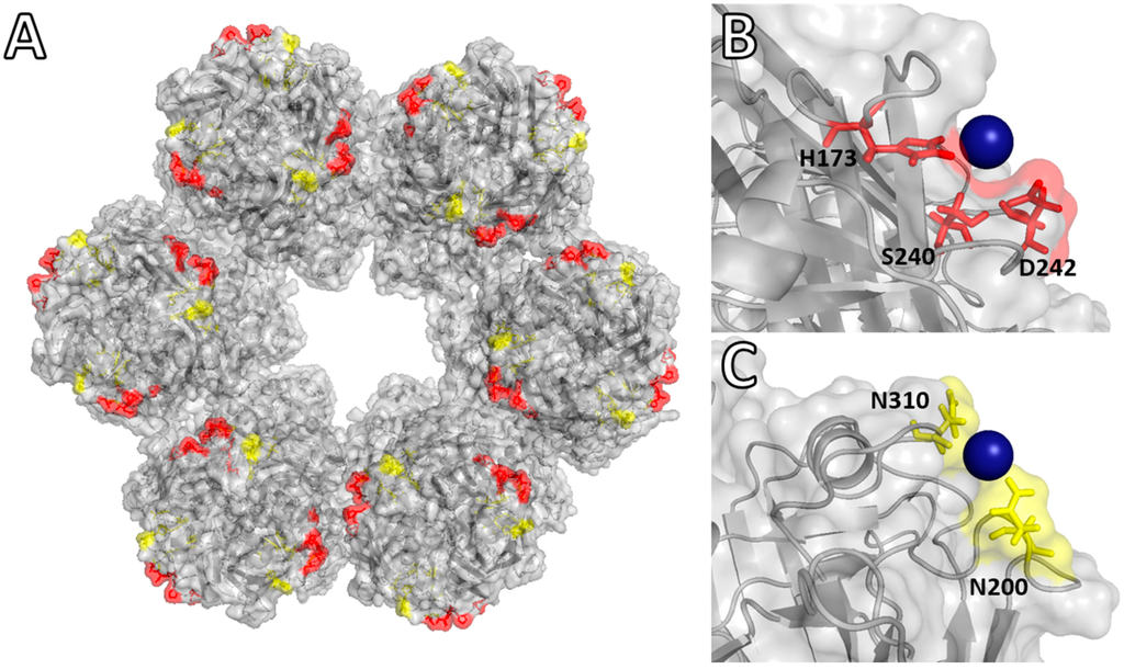 Molecular docking VP6 trimer with Pd(II) ions. (A) Hexamer of six trimers of VP6, indicating binding sites for PdCl3(H2O)− at pH 5.0 (red) and pH 8.0 (yellow). (B) Pd(II) binding site at pH 5.0. (C) Pd(II) binding site at pH 8.0. Molecular modeling with UCSF Chimera v1.10 and PyMOL V1.5 (Schröndinger) with PDB files 1QHD, 3N09, and 3IYU [24,25,26].