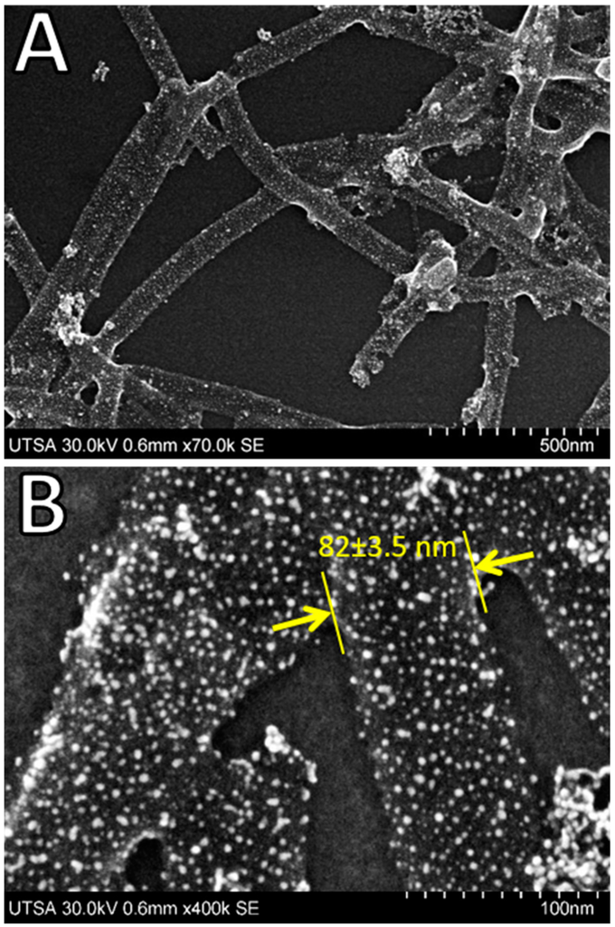 FE-SEM imaging of VP6-Pd. (A) Low magnification SEM. (B) High magnification SEM, indicating nanotube diameter of 82 ± 3.5 nm. Imaging with UHR-FE-SEM HITACHI, operated at an accelerating voltage of 30 kV.