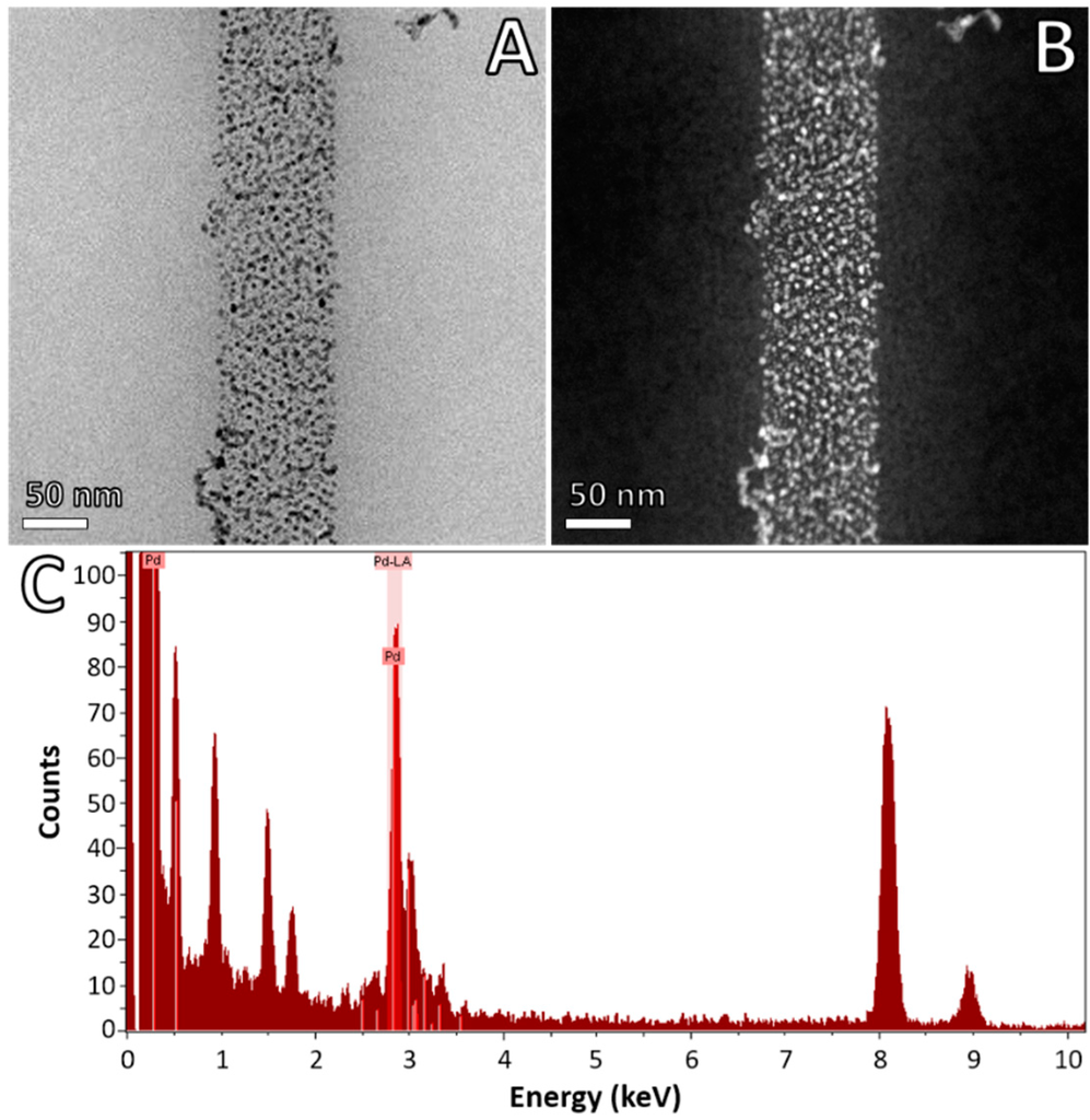 Cs-STEM imaging at low magnification provided a general view of the protein nanotubes conjugated with Pd (Figure 3). The size distribution of Pd ranged from 1–5 nm, with a media of 2.5 ± 1.02 nm in diameter (Figure S1). EDX spectroscopy confirmed the presence of palladium, with a prominent presence of characteristic X-ray peak of Pd centered at 2.838 keV (Figure 3C). The rest of the peaks corresponded to copper and aluminum (from the grid and holder, respectively), and light elements (C, N, O) from the protein template and carbon support. The results of nanoparticle sizes achieved in this work are in accordance with previous reports where it was demonstrated that PdCl3(H2O)− ionic species promotes the formation of small Pd nanoparticles [4,5], which reinforce the observations from the molecular simulation experiments.