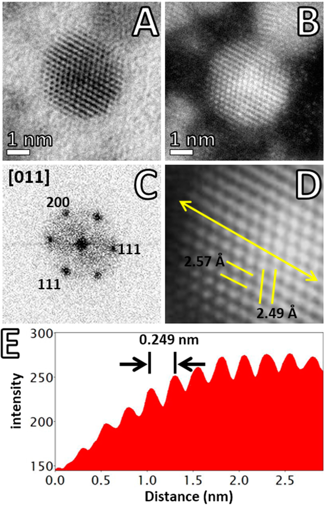 High-resolution Cs-STEM imaging of VP6-derived Pd particles is shown in Figure 4. A HAADF detector provided high contrast for electrodense Pd aggregates in comparison with the bright field (BF) detector (Figure 4A,B). Most of the Pd was located in well-defined nanoparticulate aggregates, but, remarkably, HAADF-STEM revealed the presence of high contrast individual Pd atoms attached to the protein surface (Figure 4B and Figure S3) not previously observed on virus-derived hybrid nanomaterials characterized with conventional TEM. The advantage of HAADF detector is allowing a direct interpretation of incoherent Z-contrast (where Z is atomic number), in this case to easily distinguish Pd atoms from low contrast light atoms forming the proteins. Importantly, new generation STEM instruments accessorized with a spherical aberration corrector can reach sub-angstrom resolution (<0.70 Å) even at low accelerating voltages (60–80 keV) [23]. This spatial resolution was previously only possible at high voltages of 300 keV, but with the risk of irreversibly damaging or altering the sample integrity due to the high electron dose needed. Cs-STEM imaging of Pd nanoparticles clearly revealed the crystallinity of the small particles and the atomistic structure. The Pd particle shown in Figure 4C corresponded with an fcc (face centered cubic) structure with a well-defined hexagonal shape [40]. The FFT pattern indicated that it was oriented in (011) with respect to the electron beam structure. Atomic resolution HAADF-STEM imaging revealed, in detail, the interplanar distances of 2.57 and 2.49 Å (Figure 4D), whereas the intensity profile over the nanoparticle surface clearly showed the regular stepped arrangement of palladium columns with a regular spacing of 0.249 nm (Figure 4E).
