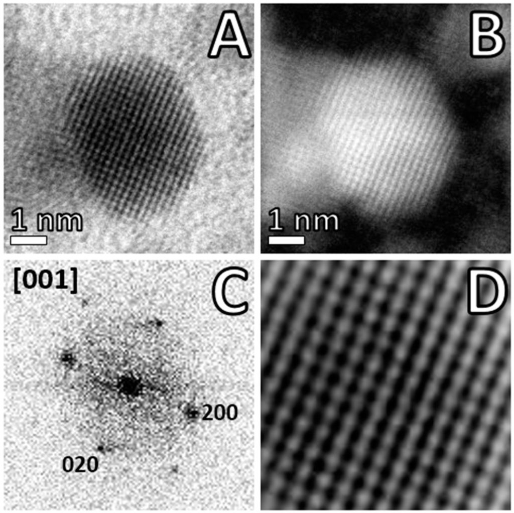 The structure and arrangement of bio-derived metal particles are commonly characterized by transmission electron microscopy (TEM), high-resolution TEM, scanning electron microscopy (SEM), atomic force microscopy (AFM), scanning tunneling microscopy (STM), and also through spectroscopy techniques, such as small angle X-ray scattering (SAXS) and X-ray diffraction (XRD). However, in some cases, when resultant particles are ultra-small, details of their size, shape, structure, and crystallinity are missing due to the technical challenges imposed or simply by the limitation in the resolution of conventional electron microscopy. With the recent development of improved cold field-emission electron guns and the incorporation of spherical aberration correctors into the electron microscope column, nowadays STEM with a high-angle annular dark field detector stands as the instrument of choice for atomic resolution imaging [23]. Among the many advantages of STEM are the ability to directly interpret incoherent Z-contrast (where Z is the atomic number) images, to simultaneously collect EELS or EDX information of the imaged sample, and finally reducing or avoiding radiation damage and ionization of sensitive samples (by the low voltage dose employed) while keeping atomic resolution.