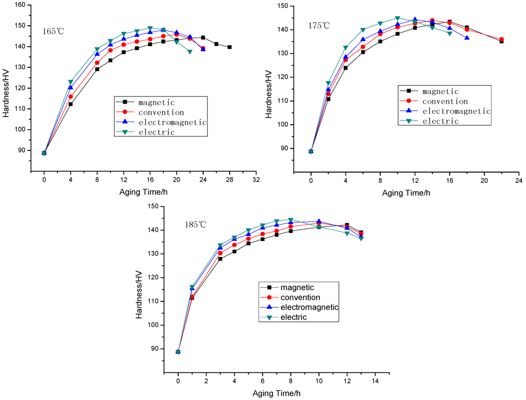 Figure 2 showed the hardness curve under normal artificial aging and the application of different external fields in different aging temperatures (165 °C, 175 °C and 185 °C). Figure 2 indicated that the hardness value of the material showed a quick increase and then increase slowly and reached to the peak, then declined under the effects of various external fields. Moreover, as temperature rose, the aging time for the hardness to reach to the peak gradually declined, which meant that rising temperature may accelerate the aging process.