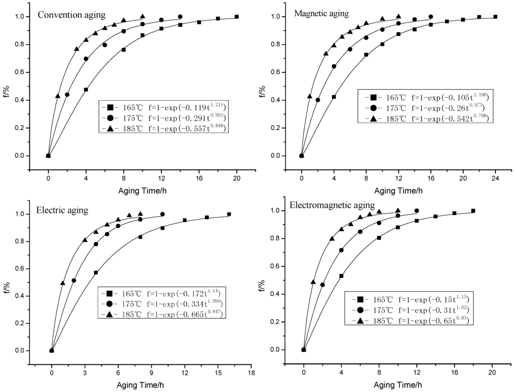 where, k0 is diffusion constant, R is gas constant, T is thermodynamic temperature, Q is diffusion activation energy. According to the analysis of the parameters in the formula, the main factors that affect diffusion are diffusion coefficient k0, temperature T and diffusion activation energy Q etc. According to the performance of hardness in under-aged condition under the effect of different external fields, the percentage of aging transformation can be similarly expressed with the percentage f of aging hardness of different time lengths and peak hardness [12,13]