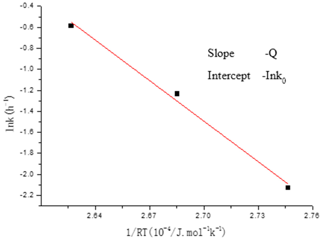 Take the logarithms from both ends of Formula (2), and the formula after conversion lnk = lnk0 − Q/RT can be obtained. Take 1/RT as the abscissa, lnk as the ordinate, then they can be seen as a linear equation. With −Q being seen as the slope and lnk0 as the intercept, the activation energy Q after conventional aging can be obtained through the linear fitting of 1/RT and lnk with the use of origin. The conventional aging fitting curve is shown in the following graph. Similarly, the curves under effect of other external fields can be fitted.