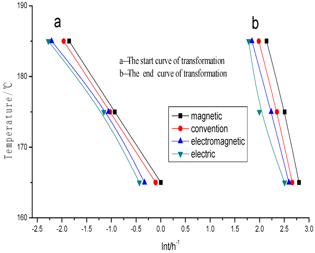 Therefore, the “C” curve of 2219 aluminum alloy time-temperature-transformation drawn is shown in Figure 5. It is observed that the time of transformation gradually shortens as temperature rises within the range of 165 °C–185 °C without any tip point. The departure line of phase transformation moves differently under the effect of different external fields; the time temperature transformation curve moves right under the effect of magnetic field in comparison with conventional aging, indicating that the application of magnetic field expands the induction period of aging process, and increases the completion time of phase transformation. However, the time temperature transformation curve moves left under the effect of electromagnetic field or current, indicating that the induction period of aging process is shortened. By comparison, it is discovered that the curve moves a slightly more left when it is under the effect of current, indicating that the induction period of phase transformation is the shortest under the effect of current, and so is the final completion time of phase transformation.