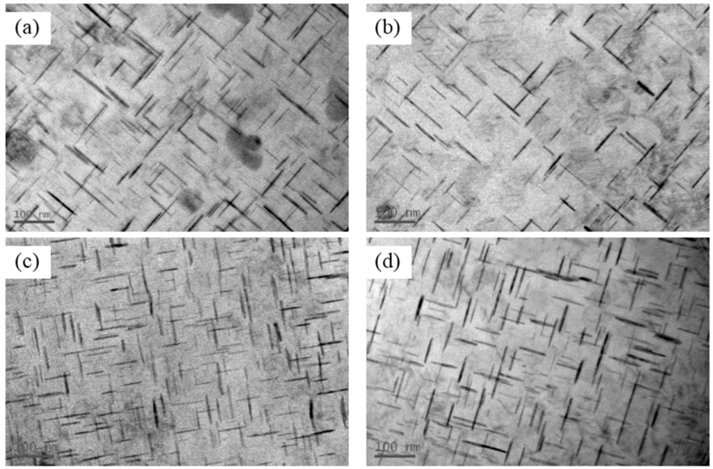 TEM images of 2219 aluminum alloy at 175 °C. (a) convention; (b) magnetic; (c) electric; (d) electromagnetic.