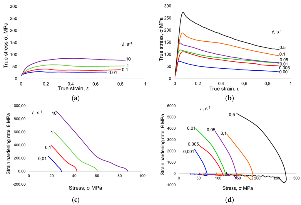The flow stress curves at temperature 1200 °C and various strain rates: (a) for single phase steel 25MoCrS4; (b) for TNB-V4-alloy; (c) Kocks–Mecking plots of 25MoCrS4; and (d) Kocks-Mecking plots of TNB-V4-alloy.