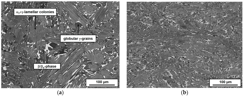 Intermetallic titanium aluminides (TiAl) alloys are relatively new class of lightweight materials which can be applied in automotive applications as well as in aviation gas turbines where they have to withstand temperatures up to 800 °C. The high potential of TiAl for these applications stems from the fact that the TiAl-based alloys have remarkable mechanical properties, such as a low specific weight of about 4 g/cm3, a high strength at elevated temperatures and a very good oxidation/corrosion resistance [1,2,3]. In recent years, forgeable β-solidifying TiAl alloys have been developed with the goal of exploiting the benefits of the hot-worked microstructure, which allows for better performance than the as-cast state. However, as many other intermetallic alloys titanium aluminides are brittle, even at elevated temperatures.