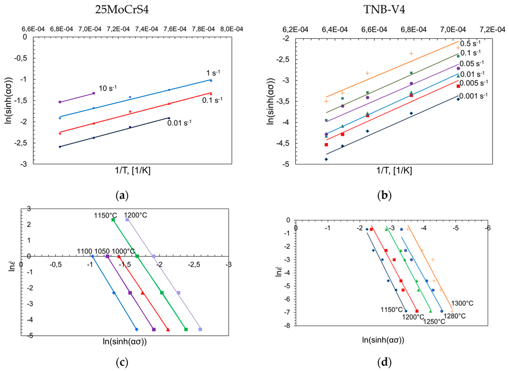 Based on Equation (10), the slope of the plots of ln[sinh(ασ)] versus ln and 1/T can be utilized for calculating the value of Qw. The required plots are shown in Figure 5. Values of 481.3 kJ·mol−1 for 25MoCrS4 and 321.2 kJ·mol−1 for TNB-V4 were obtained for the activation energy Qw.