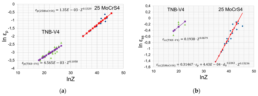 Strain depending on Zener-Hollomon-Parameter: (a) relationships between ln εp and lnZ; and (b) relationships between lnεss and lnZ.