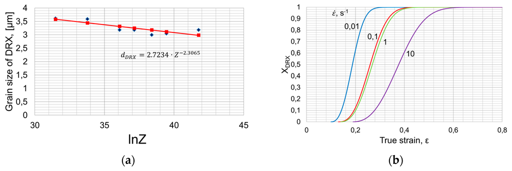 The dynamically recrystallized grain size of 25MoCrS4 increases with decreasing Zener-Hollomon parameter, i.e., by increase of temperature and decrease of strain rate the resulting grain size increases. In Figure 8a, the grain sizes determined for various Z values are shown along with the best fit of Equation (8). The kinetics of dynamic recrystallization is displayed in Figure 8b.