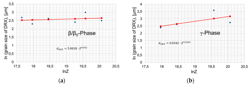 The relationship between the dynamically recrystallized grain size of the TNB-V4-alloy and the Zener-Hollomon-Parameter is shown in Figure 9. In the multiphase TiAl-alloys, solely the β/β0- (Figure 9a) and γ-phase (Figure 9b) show recrystallization. The α-phase only forms during hot forming. The typical microstructure of the TNB-V4-alloy after forming can be seen in Figure 9c.