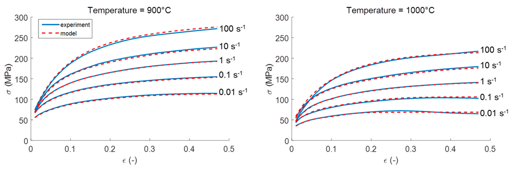 Figure 10 shows a comparison between the predicted and measured flow stress values for the 25MoCrS4 steel for temperatures ranging from 900 °C to 1200 °C and five different strain rates. The model parameters were determined in a similar way as in the previous study of Konovalov et al. [30]. However, in the present work, a new model formulation was used. A very good agreement is obtained between the calculation and measurement in view of the shape of the flow curves and the absolute level of the calculated flow stress over the entire range of strain rates and temperatures.