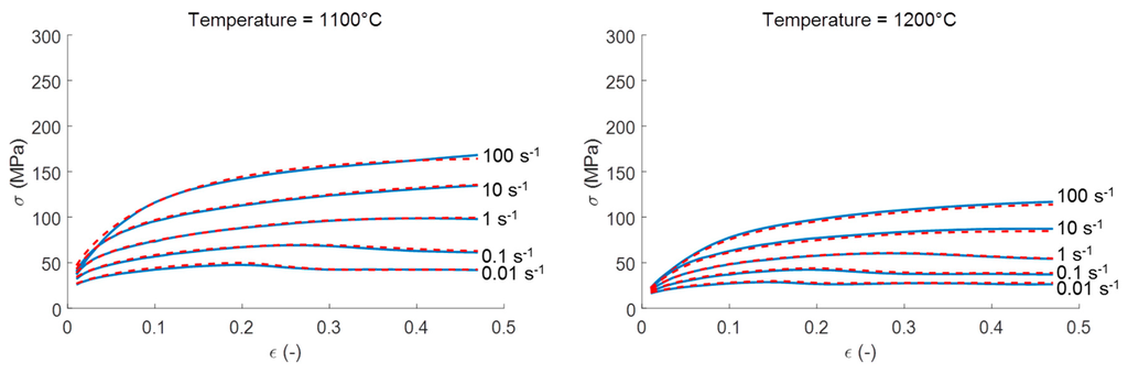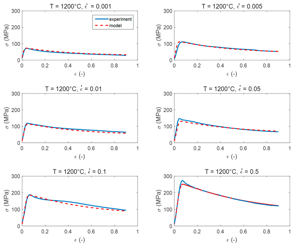 The model shows a very high accuracy for a wide range of temperatures and strain rates. In Figure 11, the comparison between the calculated and measured flow stresses is shown for the TNB-V4-alloy for strain rates varying from 0.001 s−1 to 0.5 s−1 and for a temperature of 1200 °C suitable for isothermal forging.