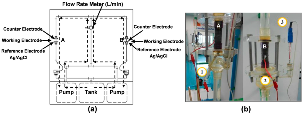 Corrosion testing circulator: (a) schematic model with flow directions (dashed lines) and (b) pipe specimens with connected electrodes: (1) counter electrode; (2) working electrode; (3) reference electrode.