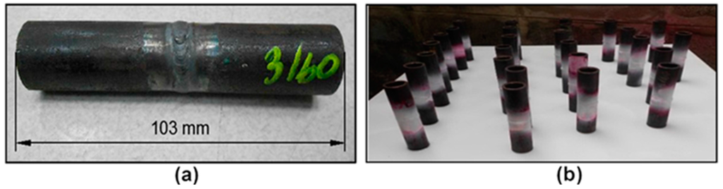 According to WPS for A106 welded pipe, a weld connection of a 103 mm distance was used as a welded piping specimen as shown in Figure 2a. Following the penetrant testing procedure, the surfaces of the specimens were cleaned. The work-piece was sprayed, covering all over the specimen, and left for 10 min for opening the surface penetrant. After that, the specimens (Figure 2b) were wiped down to remove excess penetrant and then wiped with a cleaning solution again to ensure that the excess penetrant near the weld area was removed.