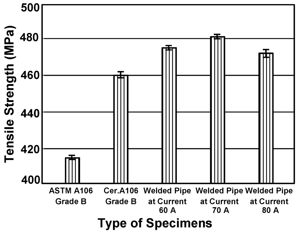 The ultimate tensile strength of ASTM A106 grade B pipe, certified A106 grade B pipe, and welded pipes from various currents at 60, 70 and 80 A.