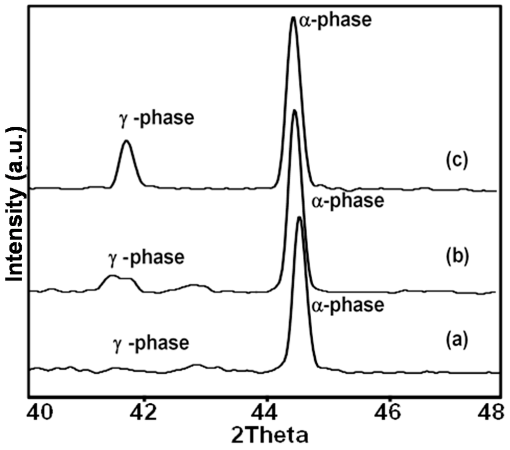 The XRD pattern was used to characterize the phase transformation (α ferrite-BCC to γ austenite-FCC) that occurred in the welded pipes [23]. Figure 5 represents the XRD patterns of the welded piping specimens obtained from various welding currents (60, 70 and 80 A). The welded piping specimen from welding current 60 A (Figure 5a) displayed a major diffraction peak of the ferrite. On the other hand, the welded piping specimens obtained from welding currents 70 and 80 A clearly exhibited the mixed phases of ferrite and austenite as shown in Figure 5b,c.